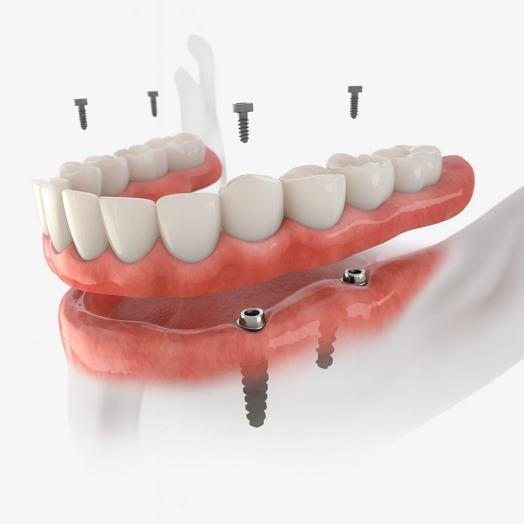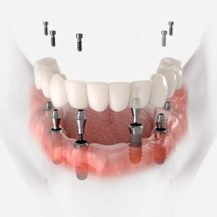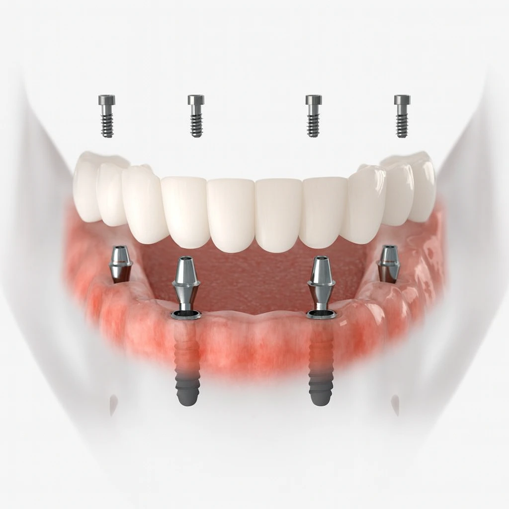 This is a life-changing treatment for people missing all or most teeth in an upper or lower arch. We use four to six strategically placed implants to support a complete arch of fixed teeth.